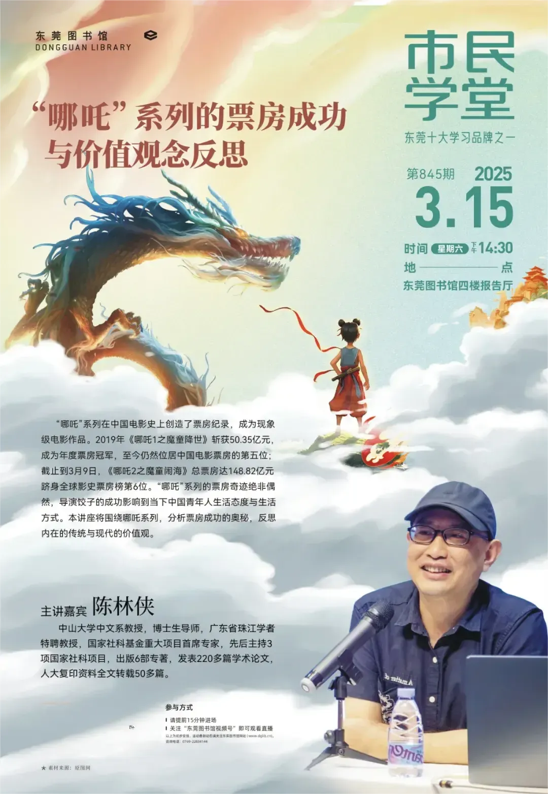 本期讲座,中山大学中文系教授、博士生导师、广东省珠江学者特聘教授、国家社科基金重大项目首席专家陈林侠老师将做客市民学堂,围绕哪吒系列电影作品,分析票房成功的奥秘,与读者朋友们一起探讨电影内在的传统与现代价值观等内容。